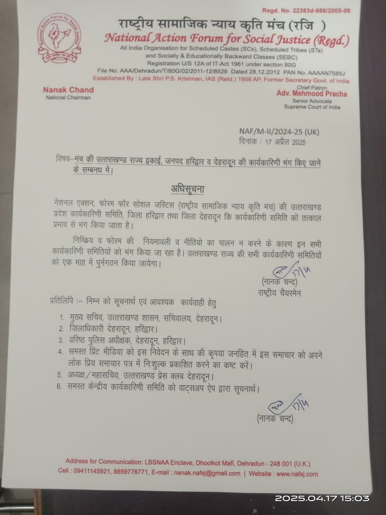 National Action Forum for Social Justice established by Late Shri P. S. Krishnan, IAS (1956 : AP) in 1993. After sad demise on 9-11-19,Adv. Mehmood Pracha will be the new chief patron from DD-MM-YYYY of the Forum.
